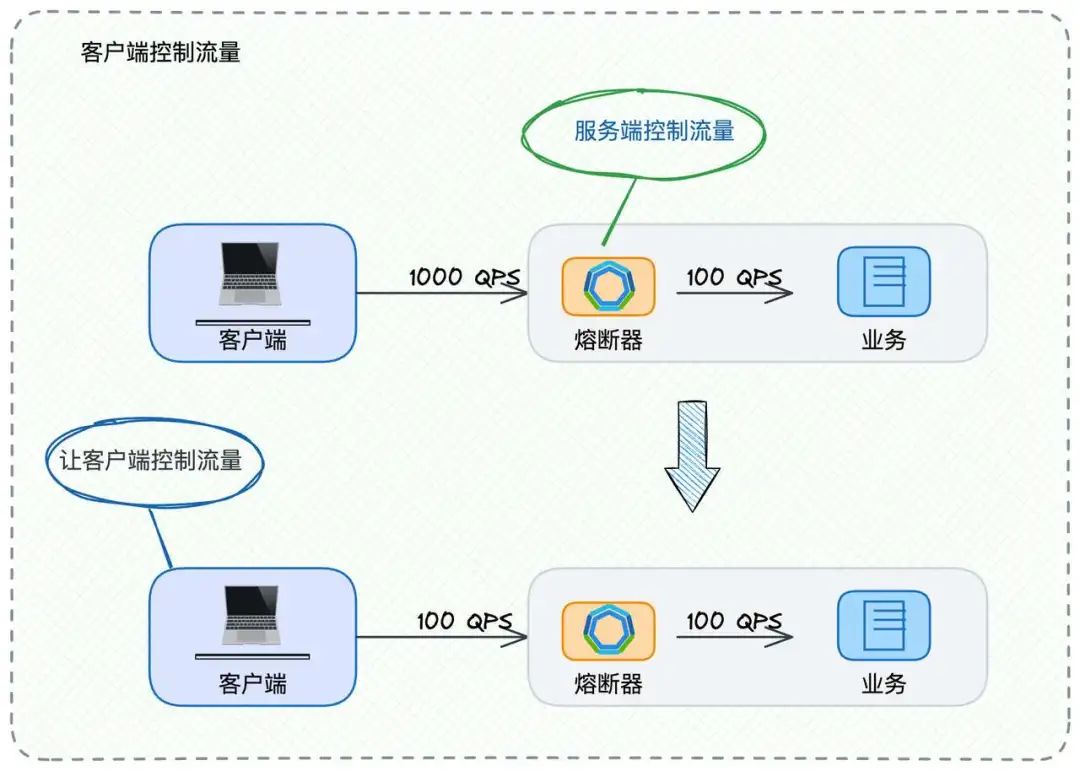 显然,这种在服务端逐步放开流量的做法,虽然比“硬着陆”要好,但还不够完美。因为在这种模式下,服务端依然接收到了100%的流量,只是在内部拒绝了大部分,这本身对服务端还是有一定消耗的。一个更自然、更优雅的想法是:能不能让客户端来配合,从源头上就控制住流量呢?